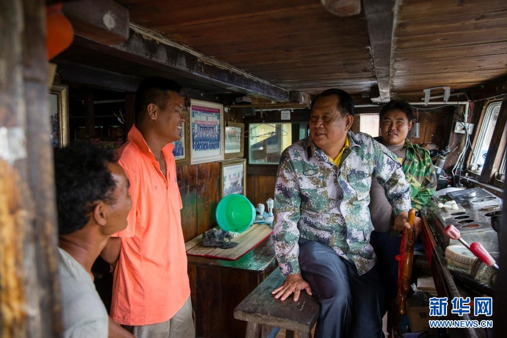 在海南省瓊海市潭門港的漁船上,王書茂(右二)與漁民交流(2018年11月14日攝)。新華社發(fā)(宋國(guó)強(qiáng) 攝)
