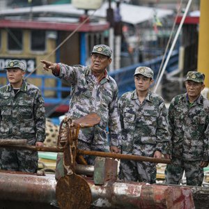 在海南省瓊海市潭門鎮(zhèn),潭門海上民兵連副連長(zhǎng)王書茂(左二)在組織民兵開展訓(xùn)練任務(wù)(2018年12月10日攝)。新華社發(fā)(宋國(guó)強(qiáng) 攝)