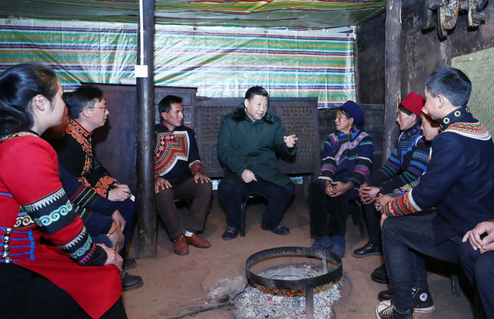 2018年2月11日,習近平在四川涼山彝族自治州昭覺縣三岔河鄉(xiāng)三河村節(jié)列俄阿木家中同村民代表、駐村扶貧工作隊員圍坐火塘邊,共謀精準脫貧之策。