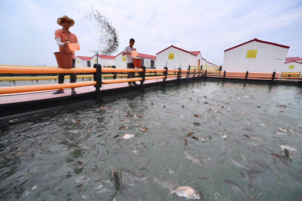 2021年7月1日,福建省寧德市霞浦縣溪南鎮(zhèn)七星海域轉型升級的深水網(wǎng)箱養(yǎng)殖區(qū)工人在喂魚。