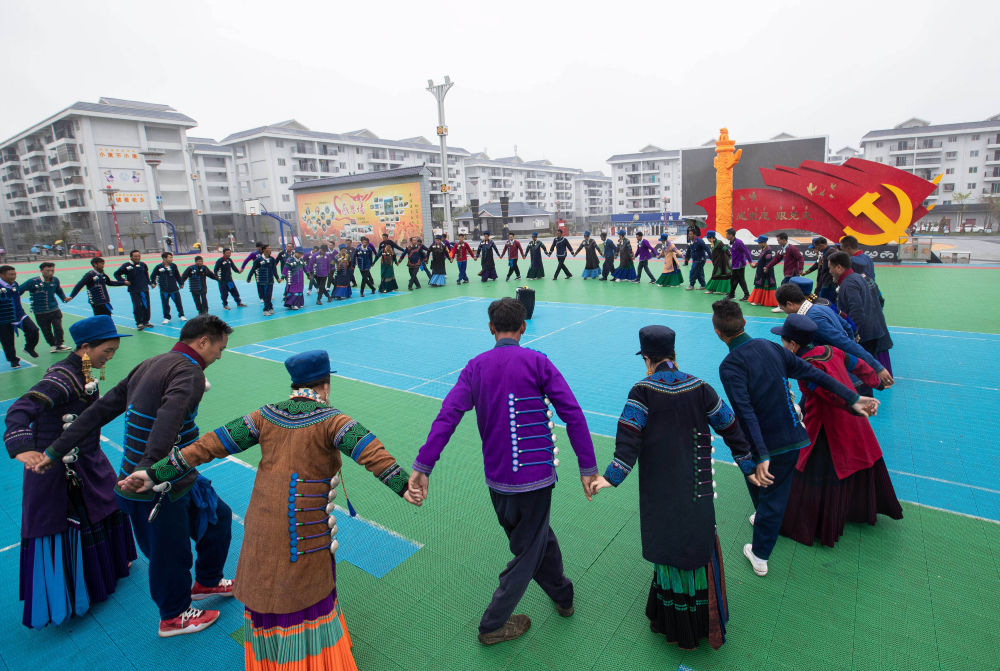2021年7月1日,在四川省布拖縣易地扶貧搬遷縣城集中安置點(依撒社區(qū)),彝族群眾在廣場上跳彝族達體舞。