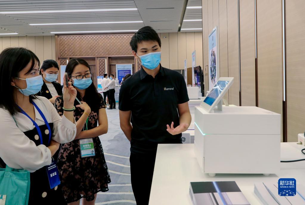 在國家會(huì)展中心(上海),第四屆進(jìn)博會(huì)食品及農(nóng)產(chǎn)品展區(qū)、醫(yī)療器械及醫(yī)藥保健展區(qū)展前供需對(duì)接會(huì)的工作人員在介紹一臺(tái)測(cè)序儀展品(7月26日攝)。新華社記者 方喆 攝