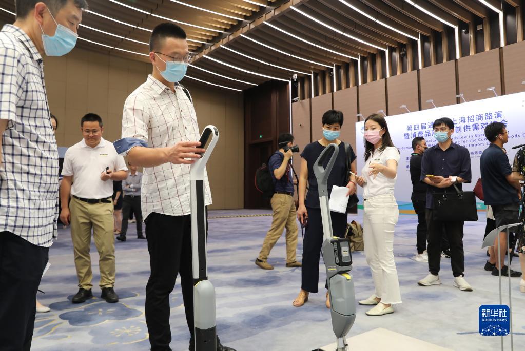 第四屆進(jìn)博會(huì)上海招商路演暨消費(fèi)品展區(qū)展前供需對(duì)接會(huì)在國家會(huì)展中心(上海)舉行,一家德國企業(yè)在對(duì)接會(huì)現(xiàn)場展出的清潔產(chǎn)品吸引參會(huì)嘉賓觀看(7月15日攝)。新華社記者 方喆 攝