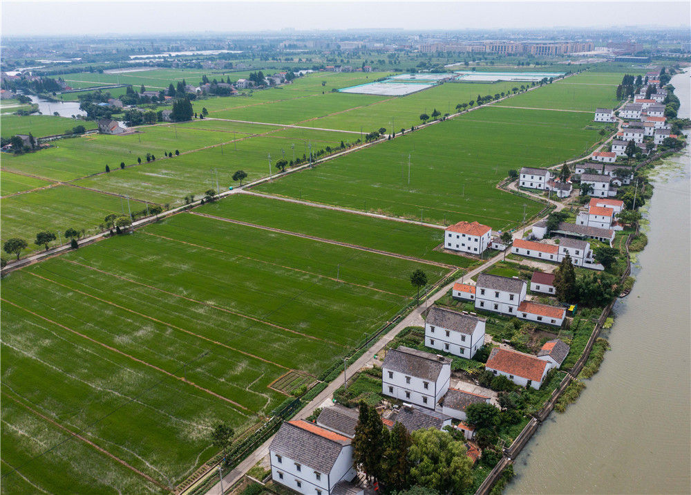 空中俯瞰浙江省嘉興市嘉善縣西塘鎮(zhèn)紅菱村的連片稻田和美麗村居(7月13日攝,無(wú)人機(jī)照片)。新華社記者 徐昱 攝