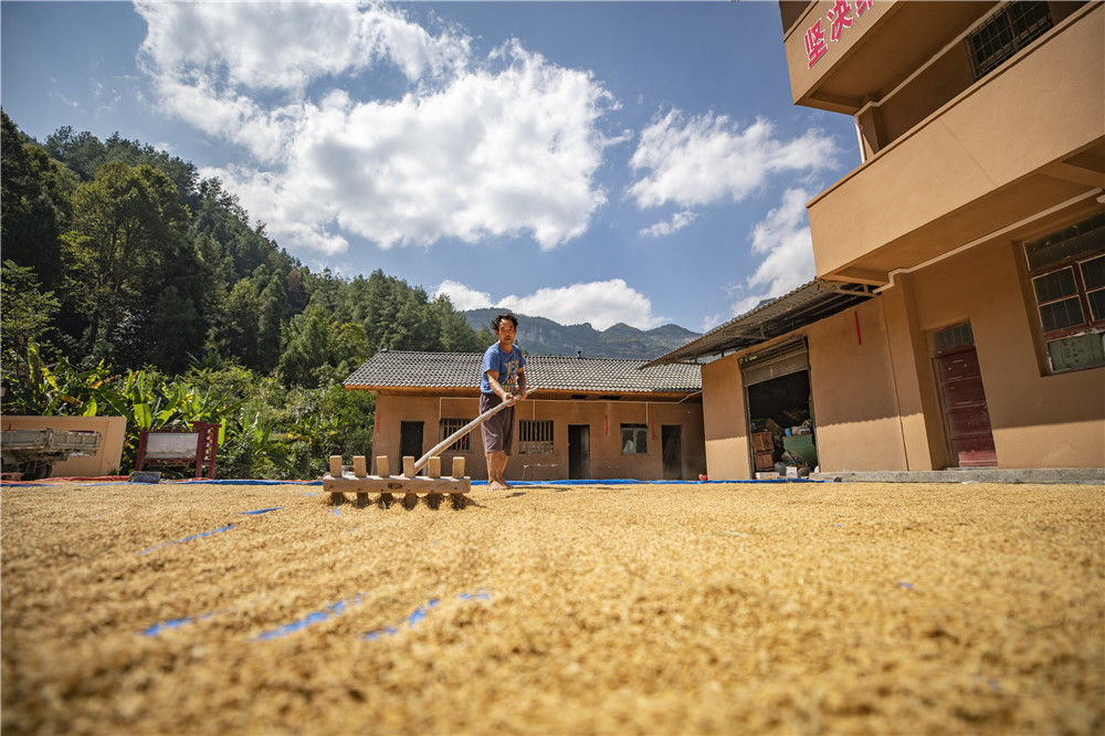 10月3日,重慶市酉陽(yáng)土家族苗族自治縣花田鄉(xiāng)何家?guī)r村村民在晾曬水稻。新華社記者 黃偉 攝
