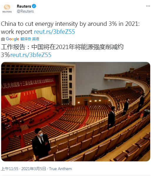 圖為兩會上的環(huán)保話題備受外媒矚目。路透社在推文中寫道,中國2021年發(fā)展主要預(yù)期目標:單位國內(nèi)生產(chǎn)總值能耗降低3%左右