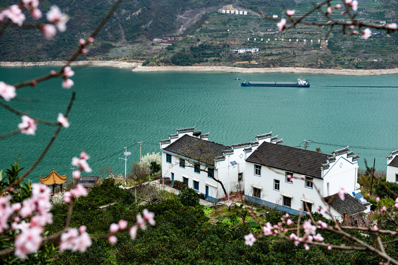 這是2021年2月27日在三峽庫區(qū)秭歸縣屈原鎮(zhèn)西陵峽村拍攝的鮮花盛開的臍橙園。湖北省宜昌市秭歸縣在建設(shè)美麗鄉(xiāng)村中,因地制宜,在臍橙園里種植桃樹、李樹等果樹。