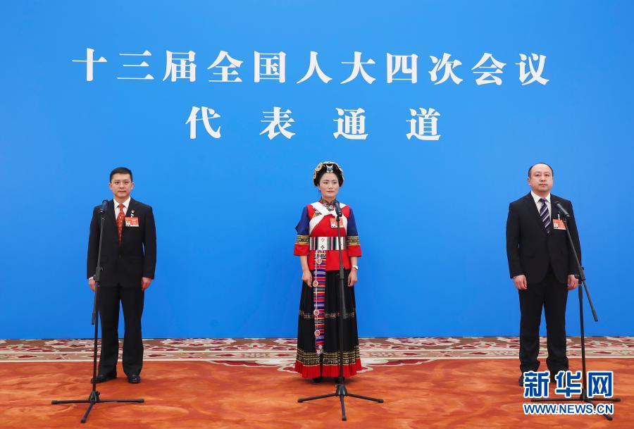 3月8日,第十三屆全國人民代表大會(huì)第四次會(huì)議舉行第二場(chǎng)“代表通道”采訪活動(dòng)。這是全國人大代表?xiàng)钫鹕?、范永貞、齊嵩宇(從左至右)通過網(wǎng)絡(luò)視頻方式接受采訪。