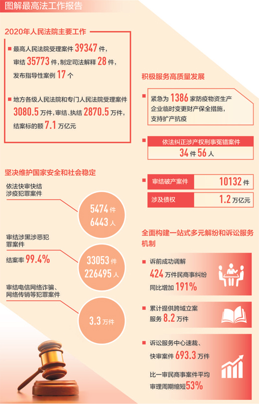 2020年,人民法院堅定不移貫徹新發(fā)展理念,緊扣全面建成小康社會目標任務(wù)依法履職盡責,審結(jié)一審民商事案件1330.6萬件、行政案件26.6萬件,積極服務(wù)構(gòu)建新發(fā)展格局、推動高質(zhì)量發(fā)展。
