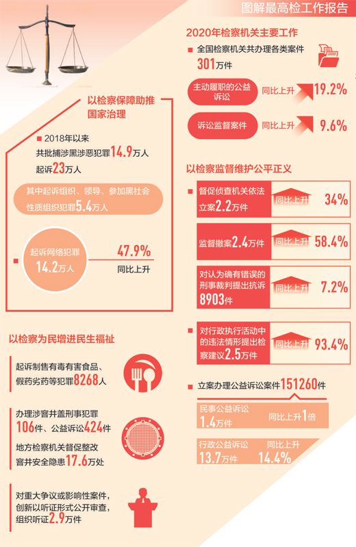 2020年,刑事檢察更加有力,民事檢察更為精準,行政檢察持續(xù)做實,公益訴訟檢察有序拓展,檢察機關(guān)在嚴格依法履職中促進社會公平正義。