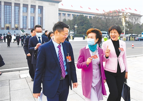 3月8日,十三屆全國人大四次會議在北京人民大會堂舉行第二次全體會議。會后,人大廣東代表團代表陳旭斌(左)、程萍(中)、郭姣(右)就宏觀政策保持穩(wěn)定等話題繼續(xù)交流。經(jīng)濟日報-中國經(jīng)濟網(wǎng)記者 李景錄攝