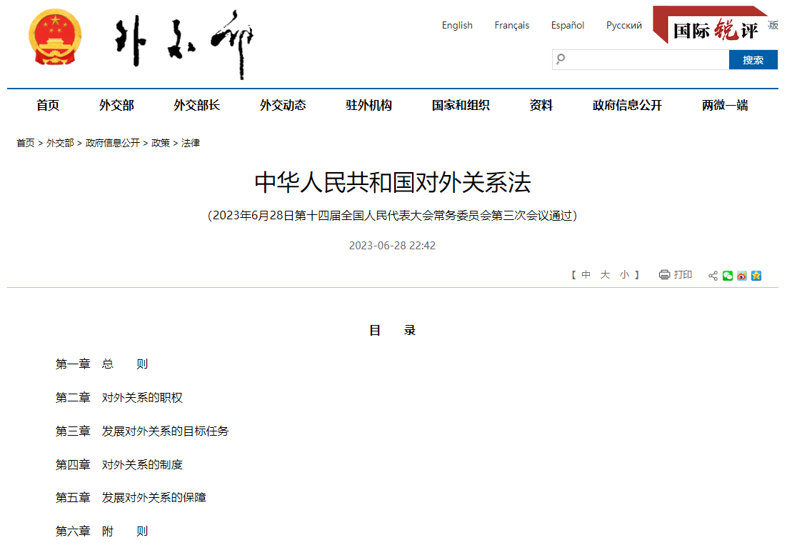 從7月1日起,《中華人民共和國對外關(guān)系法》正式施行。這是新中國首部基礎(chǔ)性、綱領(lǐng)性、綜合性對外關(guān)系法律,為中國與世界交往提供了更完善的法律遵循。它將讓世界更好地了解中國,了解中國推動構(gòu)建人類命運(yùn)共同體的堅定信念,了解中國維護(hù)國家主權(quán)、安全和發(fā)展利益以及國際公平正義的決心和擔(dān)當(dāng)。新加坡《聯(lián)合早報》引述專家的話評價說,這部法律展現(xiàn)了中國外交政策原則,將中國執(zhí)政黨領(lǐng)導(dǎo)外交事務(wù)的論述以法律形式進(jìn)行了確立。