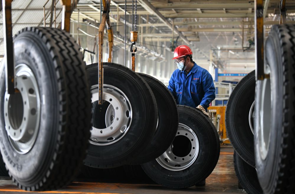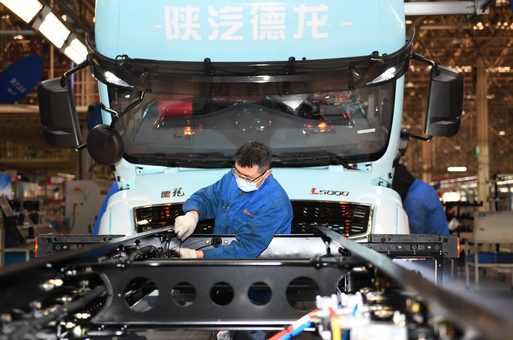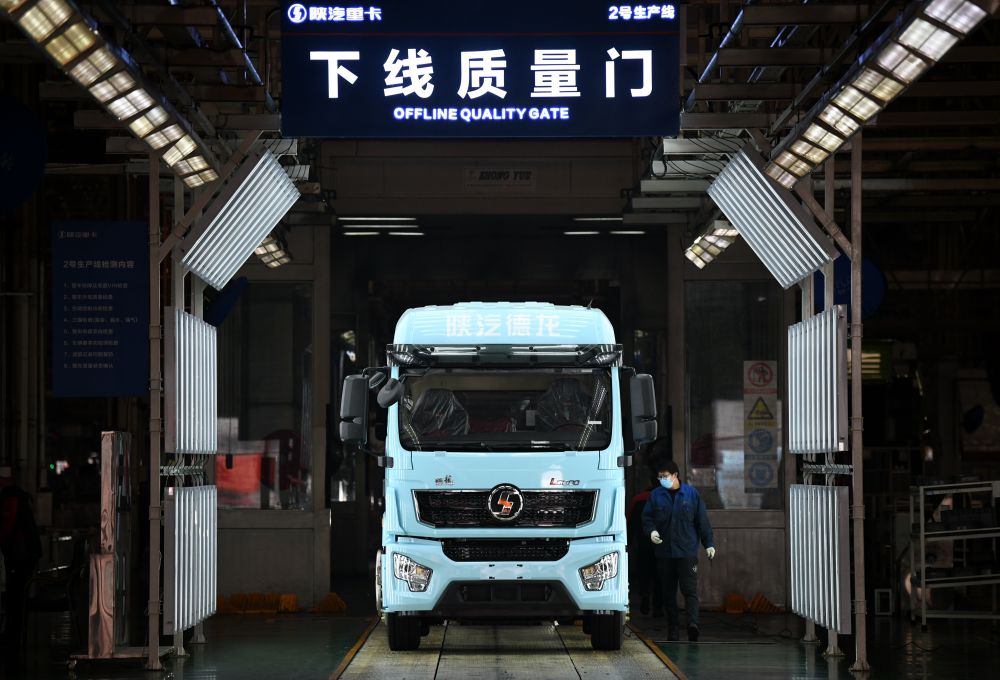 1月20日,工作人員在陜西汽車控股集團有限公司總裝車間進行重型卡車驗收。