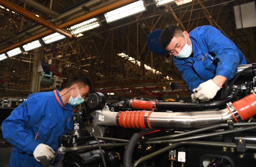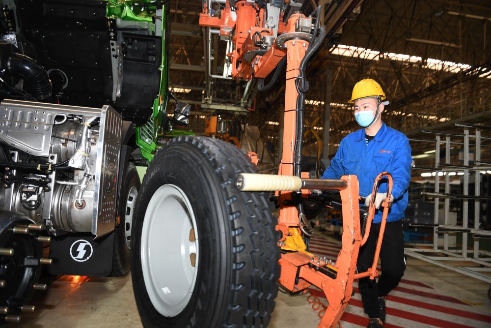 1月20日,工人在陜西汽車控股集團有限公司總裝車間進行重型卡車裝配。