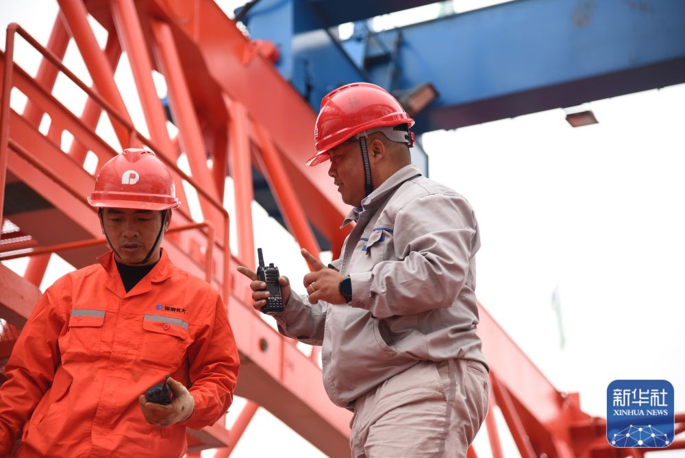 楊興義(右)在施工現(xiàn)場(chǎng)和工友討論(1月24日攝)。新華社記者田建川攝