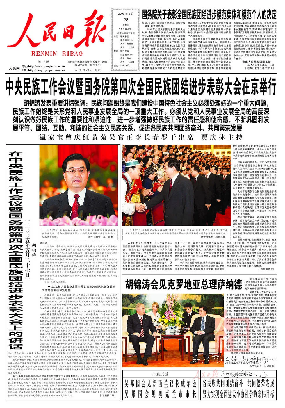 2005年5月27日至28日,第三次中央民族工作會(huì)議暨國(guó)務(wù)院第四次全國(guó)民族團(tuán)結(jié)進(jìn)步表彰大會(huì)在北京召開。
