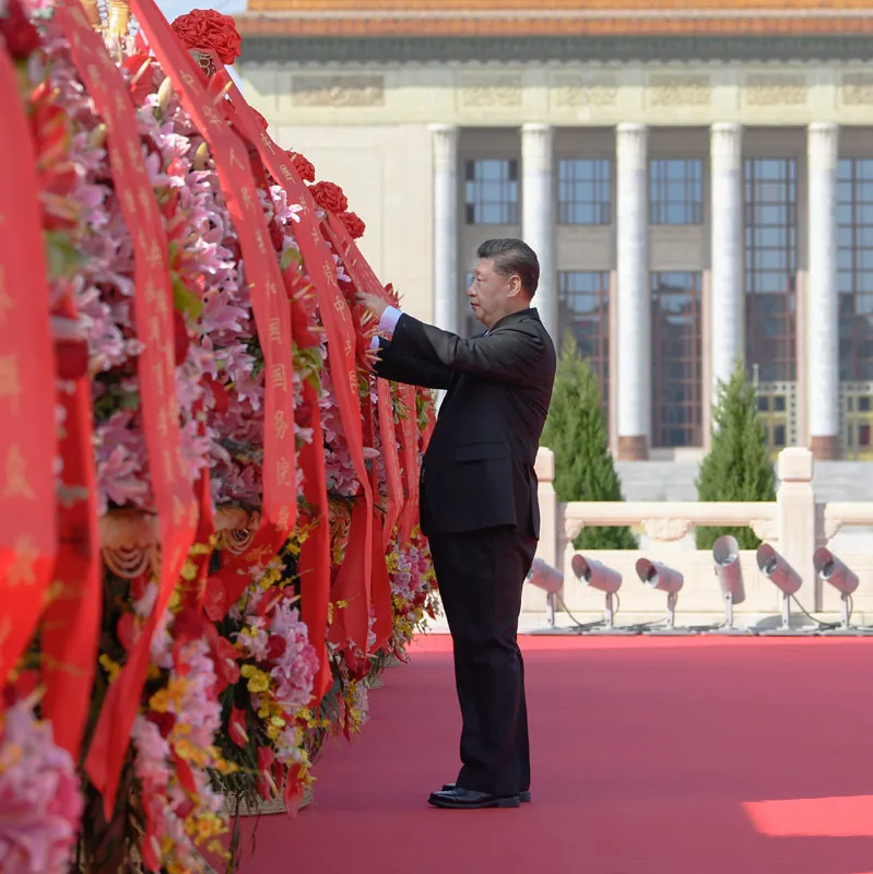 2020年9月30日上午,黨和國(guó)家領(lǐng)導(dǎo)人習(xí)近平、李克強(qiáng)、栗戰(zhàn)書(shū)、汪洋、王滬寧、趙樂(lè)際、韓正、王岐山等來(lái)到北京天安門(mén)廣場(chǎng),出席烈士紀(jì)念日向人民英雄敬獻(xiàn)花籃儀式。這是習(xí)近平整理花籃上的緞帶。新華社記者 申宏 攝