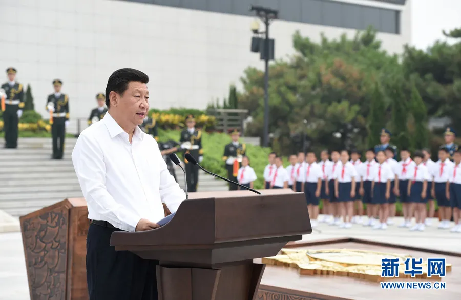 【現(xiàn)場(chǎng)】2014年7月7日,首都各界在中國(guó)人民抗日戰(zhàn)爭(zhēng)紀(jì)念館隆重集會(huì),紀(jì)念全民族抗戰(zhàn)爆發(fā)77周年。習(xí)近平總書(shū)記出席紀(jì)念儀式并發(fā)表重要講話??倳?shū)記和抗戰(zhàn)老戰(zhàn)士以及少年兒童一起按下啟動(dòng)按鈕,為“獨(dú)立自由勛章”雕塑揭幕。