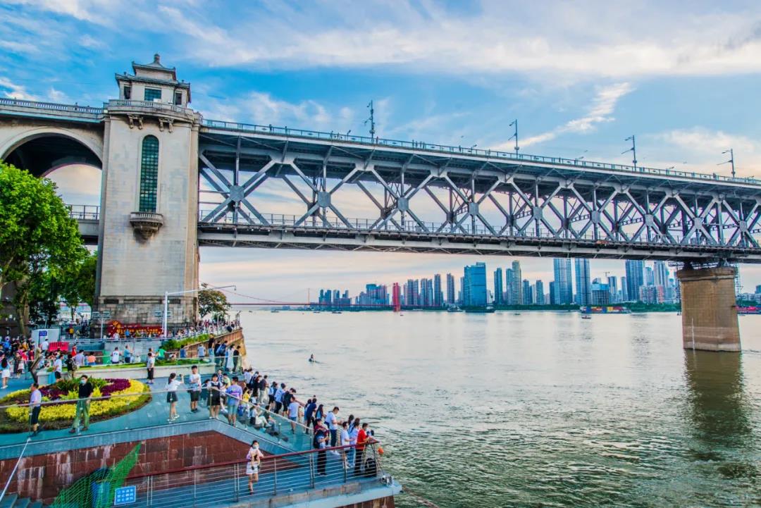 2021年6月14日,晚霞映照下的武漢兩江四岸格外美麗,吸引許多市民和游客在江邊駐足欣賞。