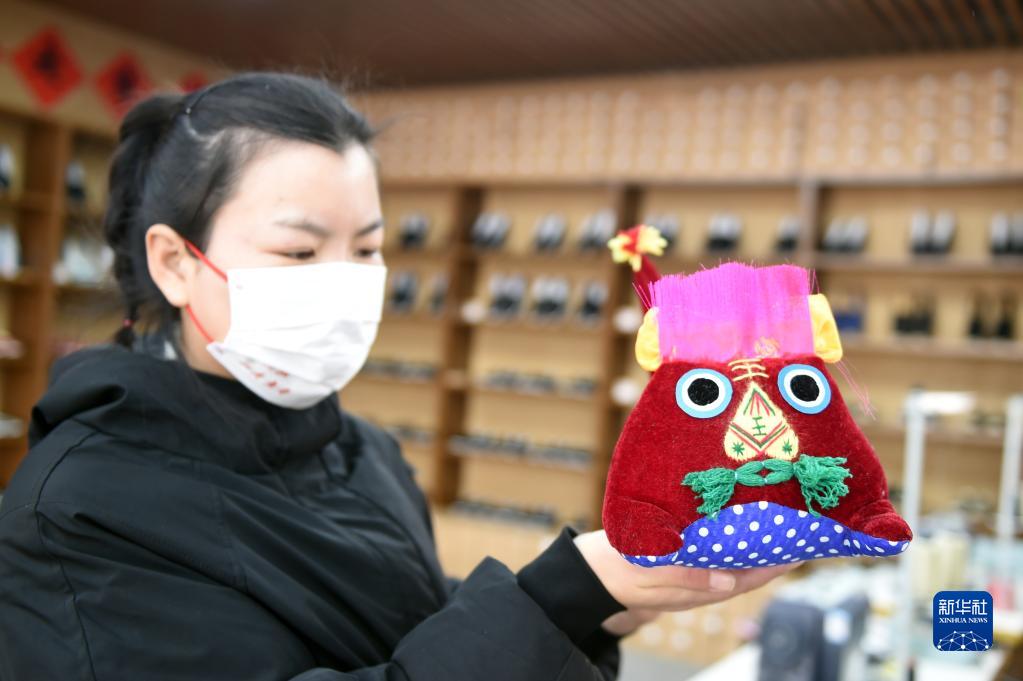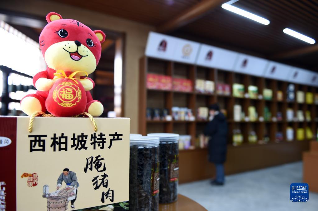 1月28日,在河北省平山縣西柏坡鎮(zhèn)北莊村西柏坡文創(chuàng)館,工作人員展示特色文創(chuàng)產(chǎn)品。新華社記者 駱學(xué)峰 攝