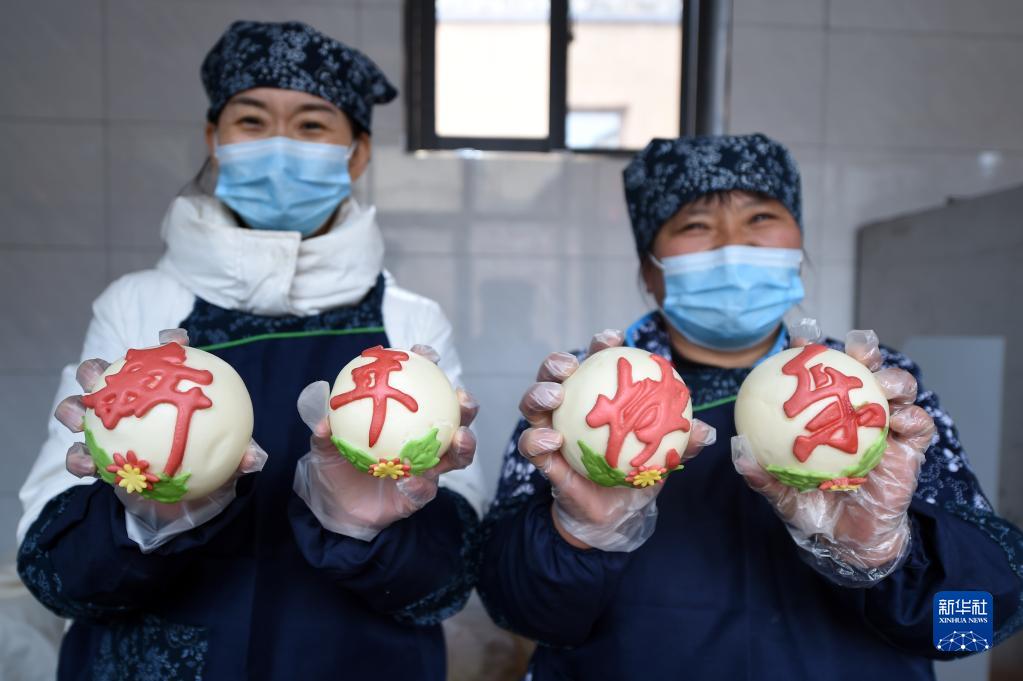 1月28日,在河北省平山縣西柏坡鎮(zhèn)北莊村團(tuán)結(jié)食堂,工作人員展示制作的特色面食。新華社記者 駱學(xué)峰 攝