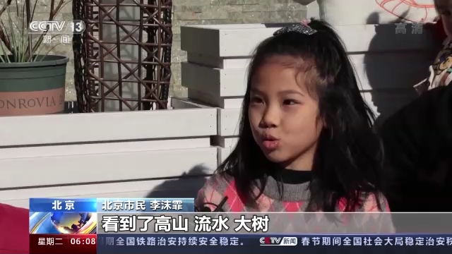北京市民 李沫霏:看到了高山、流水、大樹,在家里只有爸爸、媽媽、爺爺、奶奶和妹妹陪我過年,在這有大家一起過年了,人多了,更有那種開心的感覺。