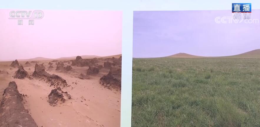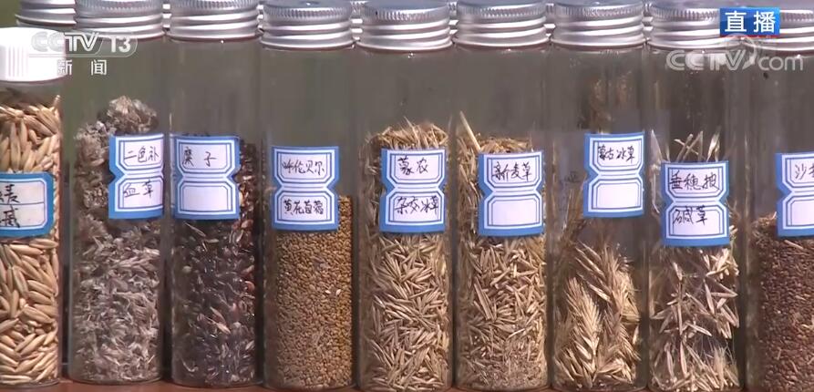 當(dāng)然,光憑著“帶薪休假”這樣的“保養(yǎng)”是遠(yuǎn)遠(yuǎn)不夠的。烏拉蓋草原的土壤屬于沙化土壤,所以一旦遇見極端天氣或者是植被被破壞后,就會(huì)產(chǎn)生風(fēng)蝕坑和沙化草地。2010年前,當(dāng)?shù)氐纳郴娣e一度超過5000多畝。我身旁的這張圖,就是當(dāng)年沙化草原的真實(shí)寫照。那么您再看右邊這副照片,通過這個(gè)小山坡可以看到兩張照片是拍攝于同樣的地點(diǎn),但是樣貌已經(jīng)發(fā)生了翻天覆地的變化,原本光禿禿的草原是如何搖身一變換上一身鮮艷的綠裝呢?那就要看我身旁的這些瓶瓶罐罐了,這里面裝著的就是草種,這是林草專家歷時(shí)多年搜尋、試驗(yàn)尋找到的適合烏拉蓋草原氣候、水土條件,能夠快速生長(zhǎng)的草種。像我手上拿的就是沙生冰草,這種草種非常適合生長(zhǎng)在沙化土壤,有很強(qiáng)的耐寒性和耐旱性,可以改良草場(chǎng),而且還非常適合放牧利用。有了這些草種以后,我們就可以進(jìn)行沙化草地的治理了,您現(xiàn)在看到的就是沙化草地的治理現(xiàn)場(chǎng),我們?cè)谄秸晖恋睾?,把這些草種進(jìn)行科學(xué)補(bǔ)播,最后鋪設(shè)沙障,通過這種科學(xué)治理的新方式來防風(fēng)阻沙,改變風(fēng)蝕狀況,讓烏拉蓋草原恢復(fù)生機(jī)。