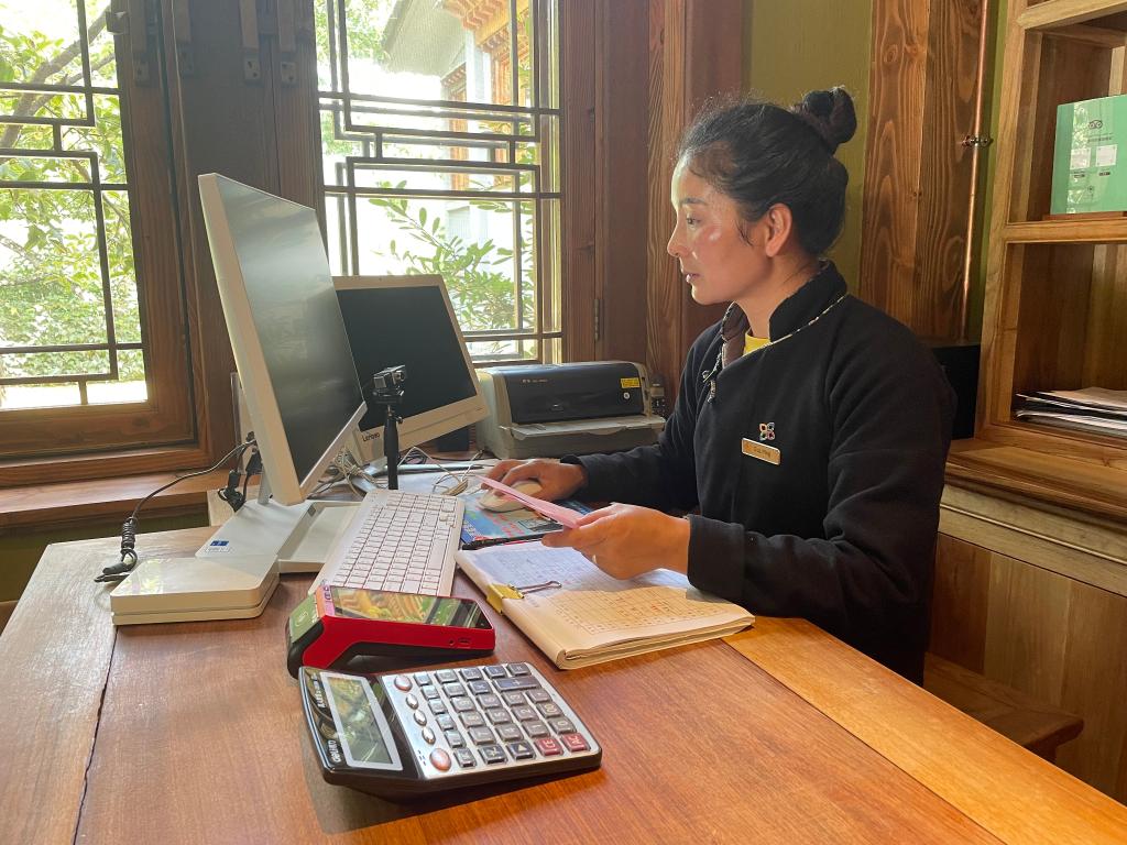 云南維西縣塔城鎮(zhèn)松贊塔城酒店負(fù)責(zé)人古麗英在操作電腦。(新華社記者楊靜攝)