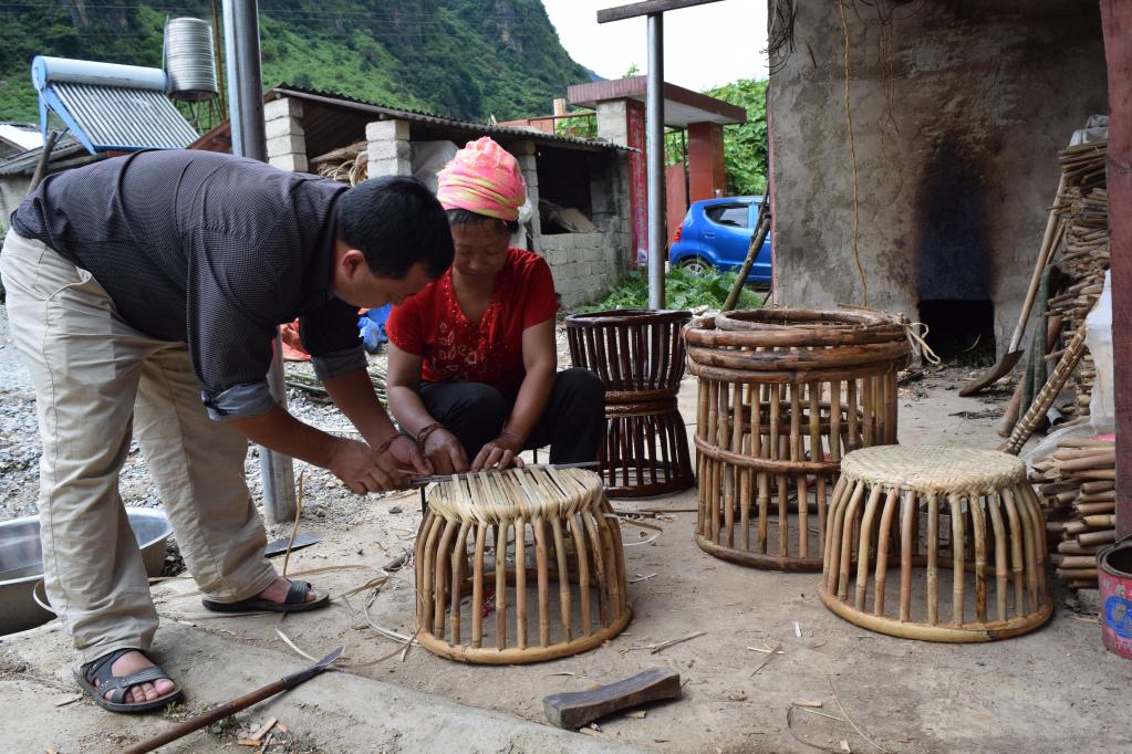 云南耿馬縣勐撒鎮(zhèn)翁達(dá)村黨總支書記俸紹春指導(dǎo)群眾編制藤蔑鼓凳。(受訪對(duì)象供圖)