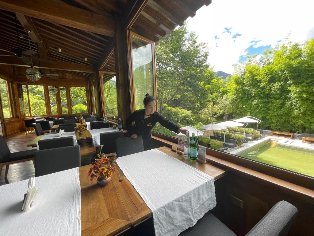 云南維西縣塔城鎮(zhèn)松贊塔城酒店負(fù)責(zé)人古麗英在整理餐桌。(新華社記者楊靜攝)