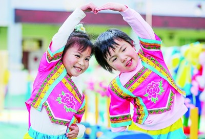 貴州省銅仁市玉屏侗族自治縣實驗幼兒園的小朋友在進行“時裝”走秀。胡攀學攝/光明圖片