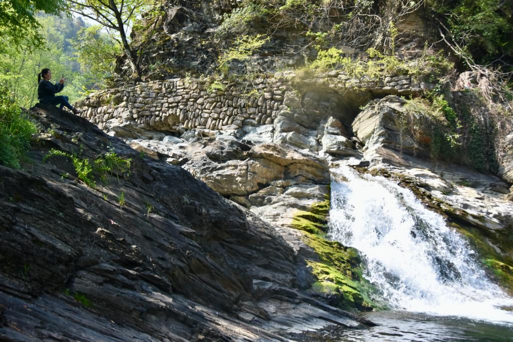 一名游人坐在漢水源村村口的瀑布旁觀景。新華社記者鄭昕攝