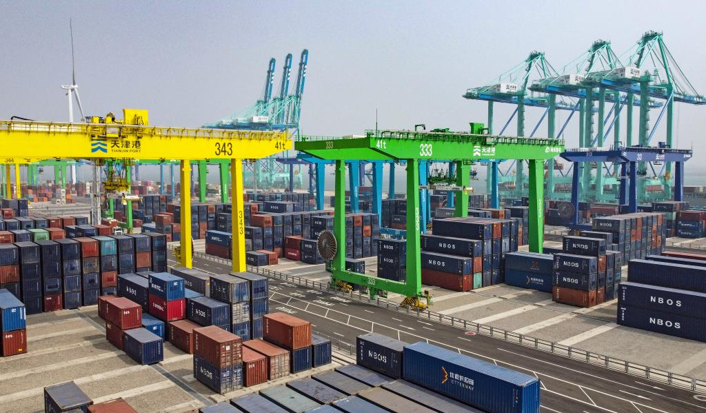 這是4月9日拍攝的天津港北疆港區(qū)C段智能化集裝箱碼頭(無(wú)人機(jī)照片)。新華社記者趙子碩攝