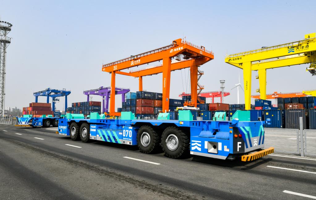 4月9日,在天津港北疆港區(qū)C段智能化集裝箱碼頭,智能水平運(yùn)輸機(jī)器人在堆場(chǎng)內(nèi)行駛。新華社記者孫凡越攝