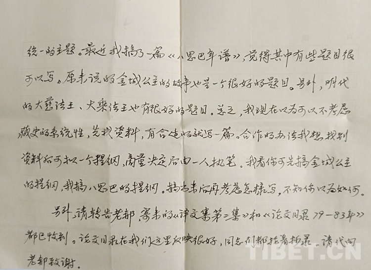 記得我大學(xué)畢業(yè)剛到新單位,人生地不熟,加之原來沉浸在“文學(xué)夢”中,現(xiàn)在陡然轉(zhuǎn)到藏族歷史研究,所謂基礎(chǔ)不牢地動山搖,困惑加不適,可想而知。陳老師在聊天中得知我的情況后,談到文史不分家,自己對文學(xué)也很有興趣,與青?!跺3薄肪庉嫼苁煜?。這樣,我遇到一個學(xué)識淵博的良師益友,聆聽指教,何其難得。在陳老師的鼓勵和幫助下,我在惶惑中嘗試把歷史與文學(xué)結(jié)合起來,與他合作發(fā)表了歷史故事新編《長安和親》《香波山奇遇—吐蕃聶墀贊普的故事》等,平穩(wěn)地完成了專業(yè)變動的過渡期。后來,他離開中央民族學(xué)院到青海社會科學(xué)院工作,我們之間仍堅持信件往來,得到他很多幫助。每一次通信,我們談得最多的都是學(xué)術(shù)。在某次回信中,他談及下一步合作的工作,特別提到“至于今后如何搞,我想原來定的歷史故事新編計劃似乎是太大了一點。主要從藏族史的系統(tǒng)性考慮,而沒有考慮到現(xiàn)實的需要。所以我想還是先寫主題符合現(xiàn)實需要的題目,寫歌頌民族團結(jié)、文化交流,國家統(tǒng)一的主題。最近,我搞了一篇《八思巴年譜》,覺得其中有些題目很可以寫。原來說的金城公主的故事也是一個很好的題目。另外,明代的大慈法王、大乘法王也有很好的題目??傊?,我現(xiàn)在認(rèn)為可以不考慮藏族史的系統(tǒng)性,先找資料,有合適的就寫一篇。合作的辦法我想找到資料后,可擬一個提綱,商量決定后,由一人執(zhí)筆。我看你可先搞金城公主的提綱,我搞八思巴的提綱,搞出來后再考慮怎樣寫,不知你以為如何?!?/p>