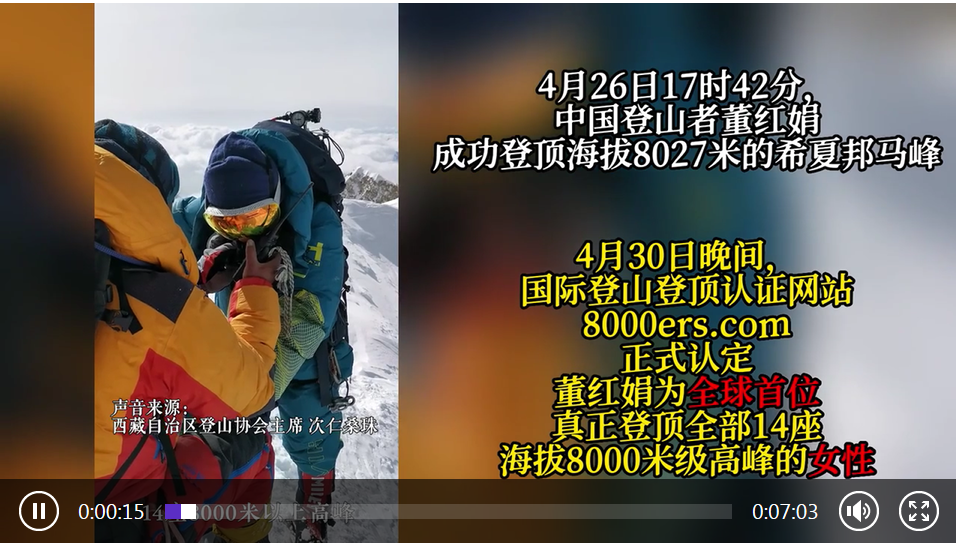 4月26日17時42分,中國登山者董紅娟成功登頂海拔8027米的希夏邦馬峰。30日晚間,國際登山登頂認(rèn)證網(wǎng)站8000ers.com正式認(rèn)定董紅娟為全球首位登頂全部14座海拔8000米級高峰的女性。
