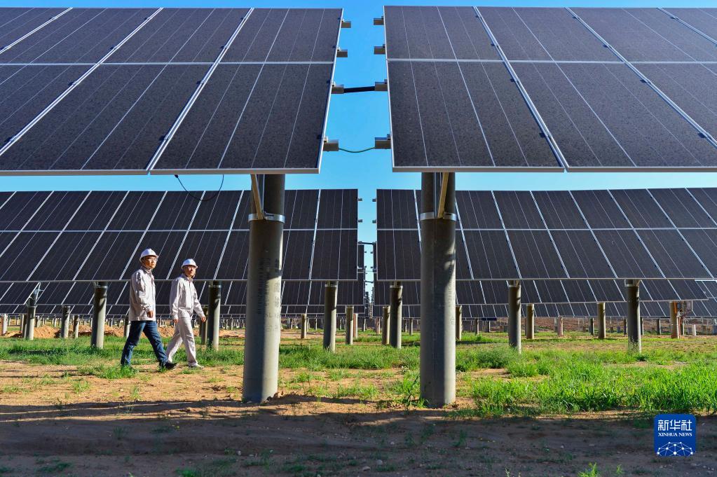 工作人員在內(nèi)蒙古自治區(qū)鄂爾多斯市伊金霍洛旗天驕綠能50萬(wàn)千瓦采煤沉陷區(qū)生態(tài)治理光伏發(fā)電示范項(xiàng)目區(qū)里巡查(2021年7月8日攝)。 新華社發(fā)(王正 攝)