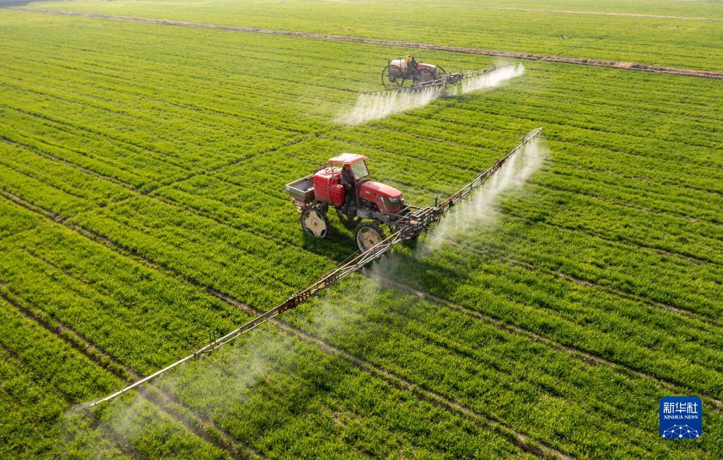 2022年3月9日,在江蘇省海安市大公鎮(zhèn)賁集村,村民駕駛植保機(jī)械在小麥田間進(jìn)行噴灑藥物作業(yè)(無(wú)人機(jī)照片)。 新華社發(fā)(翟慧勇 攝)