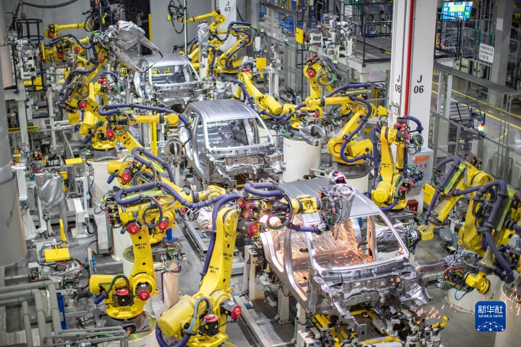 重慶一家新能源汽車(chē)企業(yè)使用智能化焊接機(jī)器人進(jìn)行焊接作業(yè)(2021年4月2日攝)。 新華社記者 黃偉 攝