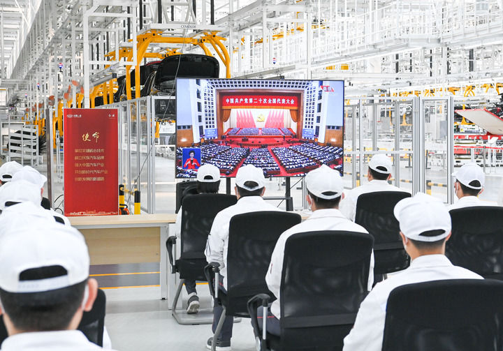 10月16日,在吉林省長春市中國第一汽車集團(tuán)有限公司紅旗繁榮工廠,職工在收看中國共產(chǎn)黨第二十次全國代表大會開幕會。新華社記者 顏麟蘊(yùn) 攝