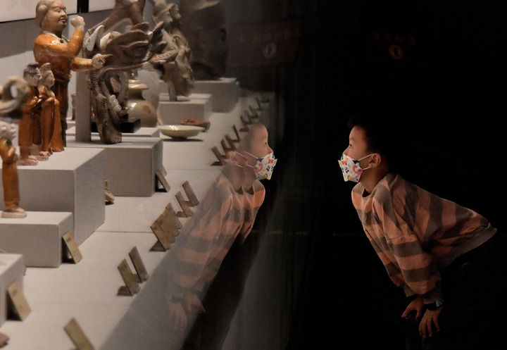 9月4日,一名小朋友在鄭州博物館觀看展品。新華社記者 李安 攝