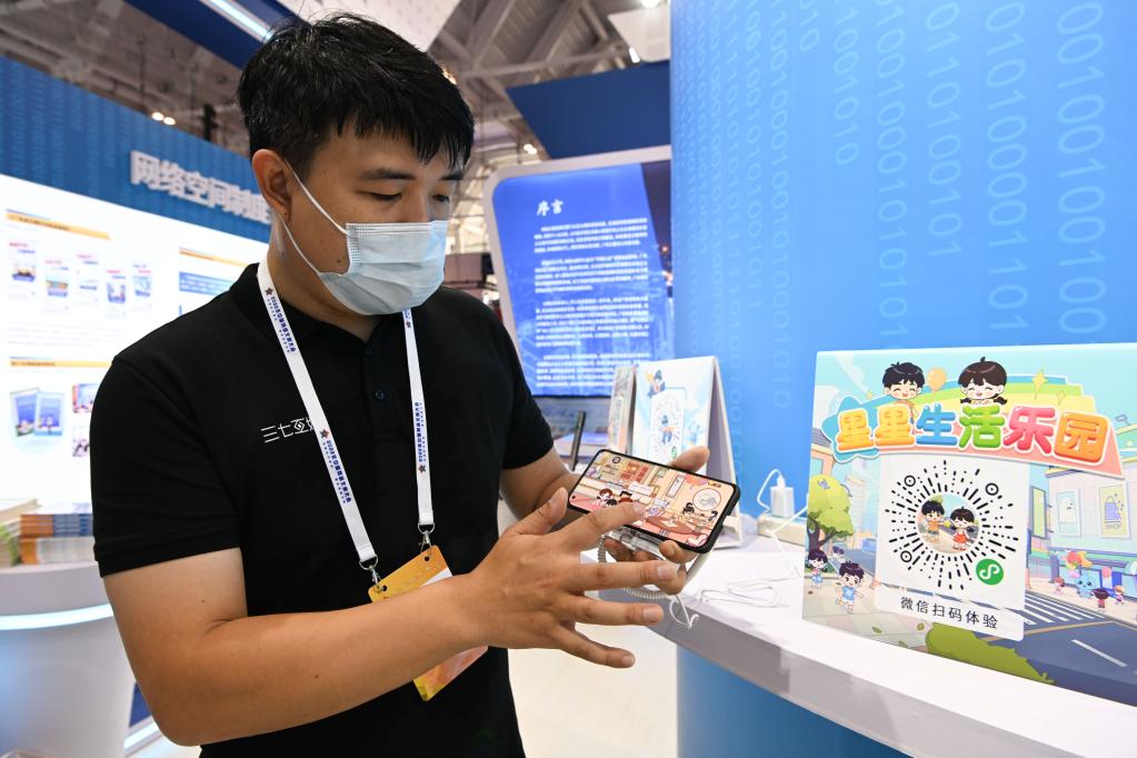 參展人員在2022年中國(guó)網(wǎng)絡(luò)文明大會(huì)上展示一款為孤獨(dú)癥兒童開(kāi)發(fā)的功能性應(yīng)用軟件。新華社記者孫凡越 攝