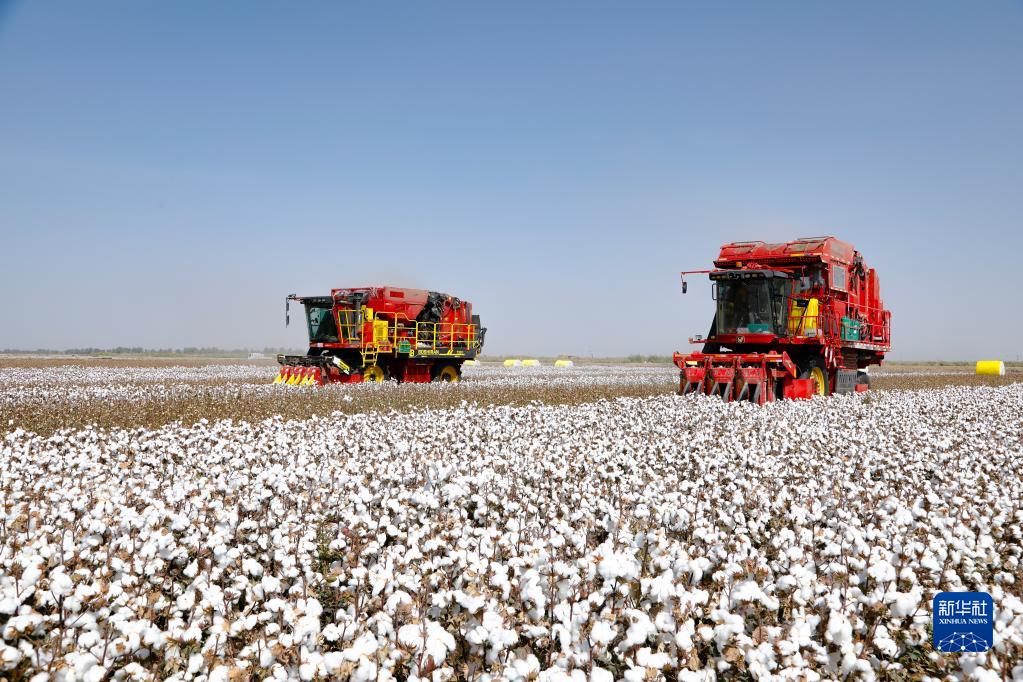 在新疆巴音郭楞蒙古自治州尉犁縣興平鎮(zhèn)統(tǒng)其克村,兩臺國產(chǎn)采棉機(jī)在采收棉花(2022年9月30日攝)。新華社發(fā)(汪志鵬 攝)