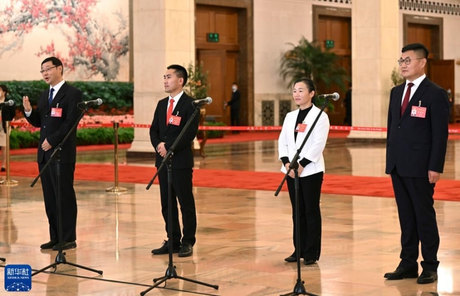 10月22日,中國共產(chǎn)黨第二十次全國代表大會閉幕會在北京人民大會堂舉行。這是閉幕會后,楊彥鋒、宋學文、祁洪芳、李紹杰代表(自左至右)步入“代表通道”,準備接受采訪。新華社記者 邢廣利 攝 圖片來源:新華網(wǎng)