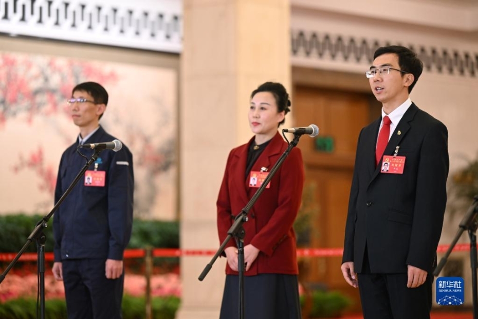 10月22日,中國共產(chǎn)黨第二十次全國代表大會閉幕會在北京人民大會堂舉行。這是閉幕會后,洪家光、楊浪浪、周雷代表(自左至右)接受采訪。新華社記者 金良快 攝 圖片來源:新華網(wǎng)