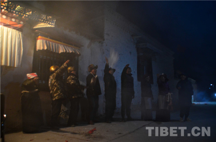 酒足飯飽后,“驅(qū)鬼”儀式開(kāi)始。家人們一起各自用糌粑從頭到腳觸碰一遍、捏下手印后,與故意吃剩的一點(diǎn)古突扔進(jìn)驅(qū)鬼盤(pán),寓意將身心中的病痛與不詳全部拋掉。隨后查斯點(diǎn)燃火把,一邊喊著“所有妖魔都出去”,一邊手持火把跑往所有屋子各掃幾下,拿著火把和驅(qū)鬼盤(pán)到交叉路口焚燒掉。一路狂奔,且不能回頭。