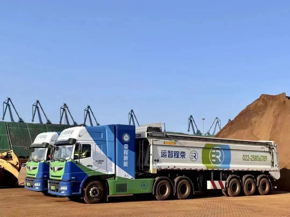 榮程集團氫能重卡在天津港碼頭裝卸礦粉。(受訪者供圖)