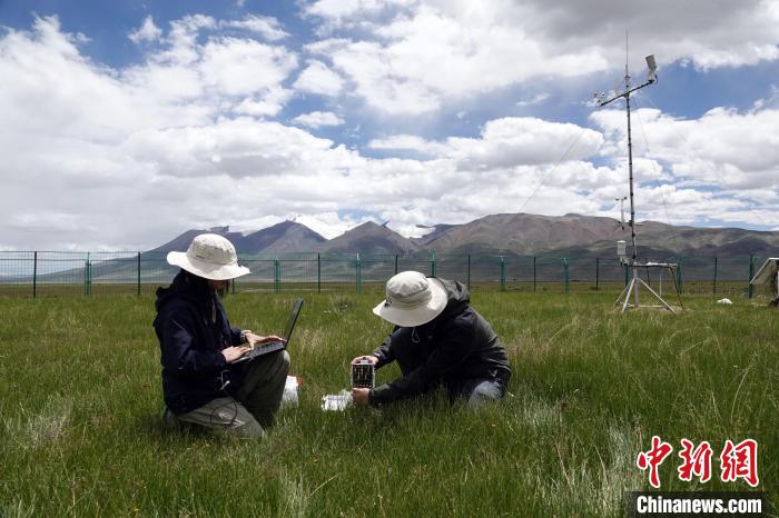 中國科學院申扎高寒草原與濕地生態(tài)系統(tǒng)觀測試驗站(申扎站)高寒濕地觀測試驗場,科研人員采集相關(guān)觀測數(shù)據(jù)。中新網(wǎng)記者孫自法攝