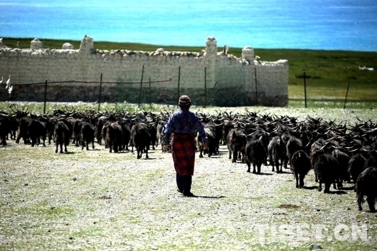 資料圖:阿里地區(qū)措勤縣牧民驅(qū)趕著紫絨山羊群前往扎日南木錯湖邊