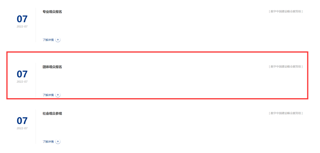 進(jìn)入數(shù)字中國建設(shè)峰會官網(wǎng),點(diǎn)擊“觀眾報名”欄目,選擇“團(tuán)體觀眾報名”。